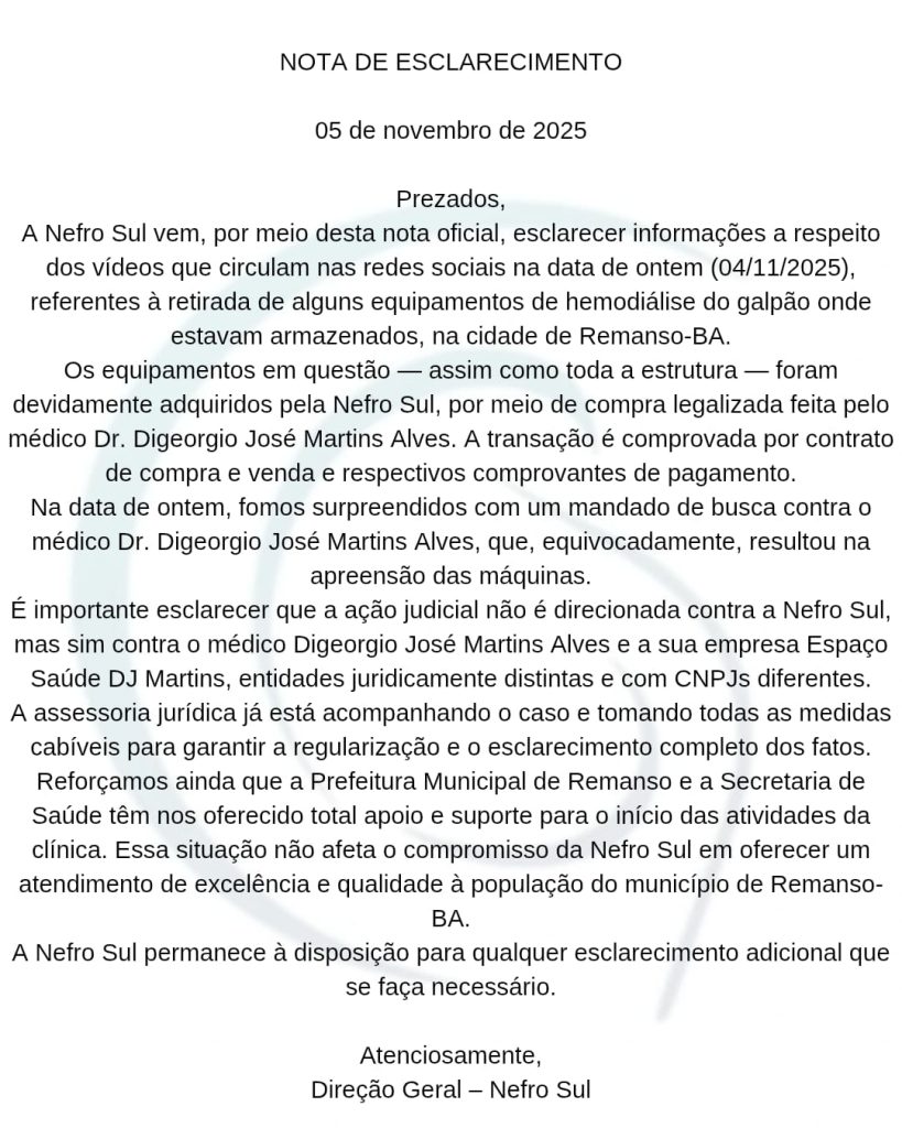 A empresa Nefro Sul divulgou, nesta terça-feira (04), uma nota de esclarecimento sobre os vídeos que circulam nas redes sociais mostrando a retirada de equipamentos de hemodiálise do galpão onde estavam armazenados, em Remanso-BA.