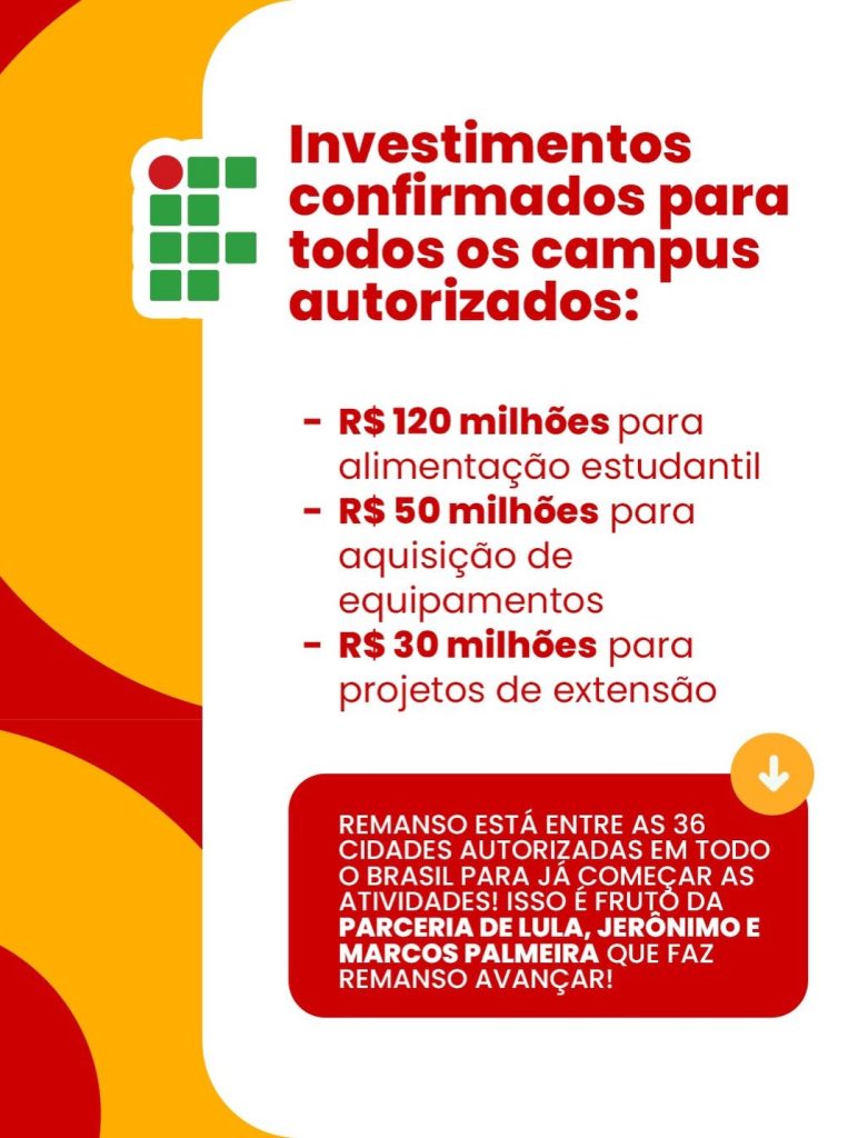 Entre os investimentos anunciados para os campi autorizados em todo o país, estão cerca de R$ 120 milhões destinados à alimentação estudantil, R$ 50 milhões para aquisição de equipamentos e R$ 30 milhões voltados para projetos de extensão. Os recursos têm como objetivo garantir estrutura adequada, inclusão e qualidade no ensino ofertado.
